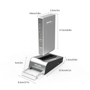 Stand vertical in baza de andocare a carcasei HDD sau SSD, Docking Station nu numai ca creeaza un aspect unic, dar va ofera acces facil la toate porturile. Asta inseamna ca puteti accesa pana la doua afisaje Full-HD (HDMI si DVI-I) pentru oglindire / extinderea desktopului la monitoare externe, precum si retea Gigabit Ethernet, microfon, difuzoare, HDD, SSD, unitate optica, imprimante , Tastatura USB, mouse si multe alte dispozitive USB.