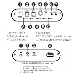 Intrare: optica x 2, o intrare coaxiala, o intrare Bluetooth 5.0, o interfata de intrare USB 2.0. puteti alege sursa de intrare cu ajutorul butonului input.