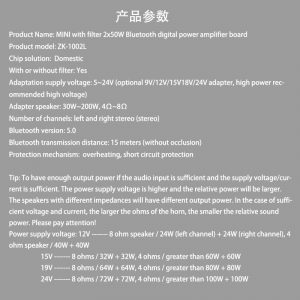 Numele produsului: Modul amplificare audio stereo, Bluetooth 5.0, 100W x 2, DC 12-24V