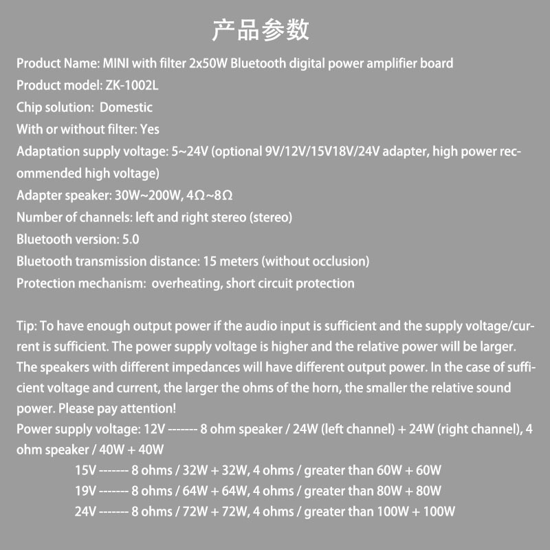 24V —— 8homs / 72W + 72W, 4 ohm / 100W + 100W